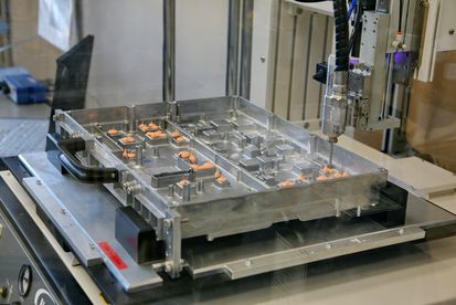 | Чтобы не перегревалась. Нанесение термогеля на корпус системного модуля — один из этапов производства базовых станций в Томске. Затем в него устанавливают платы, элементы подключения, блоки питания и вентиляторы, загружают ПО, проверяют герметичность и проводят тестирование во всех возможных режимах. |