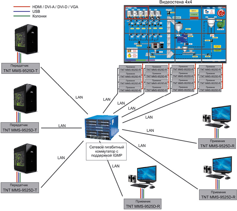 Следующий вариант, когда передатчик и приемник IP KVM подключаются в локальную сеть, снимает все описанные выше ограничения. Нет необходимости организовывать прямое соединение между передатчиками и приемниками, можно использовать разное сетевое оборудование, разные среды передачи и т.д. — главное, чтобы передатчик и приемник находились в пределах одной локальной сети.