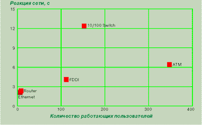FDDI и ATM обслуживают необходимое количество пользователей. Сеть FDDI поддерживает примерно 700 пользователей, но ее время реакции сравнительно велико. FDDI-сеть требует для завершения любой операции по передаче файлов на 20 с больше, чем коммутатор кадров 10/100 или ATM-коммутатор. Однако для указанной компании 20 смогут привести к ежегодным потерям в 327 тыс. дол. Для сравнения, при использовании технологии ATM можно окупить затраты на ее внедрение за год.