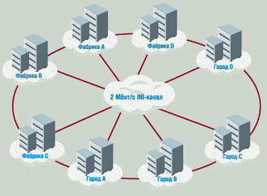 Системы COREX и COREX-L не просто совместимы между собой, а допускают различные варианты взаимной интеграции: единая централизованная система или несколько узлов, соединенных друг с другом и ТфОП при помощи каналов ISDN BRI (2B+D) и PRI (30B+D), двух- и трехпроводных аналоговых линий или цифровых линий E1 (ИКМ-30), T1. Используя восьмиузловую конфигурацию системы COREX-L, оснащенную картой межсетевого интерфейса, можно с помощью специализированных каналов INI (Inter Node Interface) строить виртуальные корпоративные сети (рис. 1). Каналы INI созданы на базе собственного протокола передачи Samsung и обеспечивают пропускную способность до 2 Мбит/с.