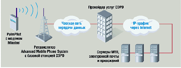 Minstrel Wireless IP Modem позволяет загрузить в PalmPilot браузер Web или клиентcкое ПО электронной почты и подключиться к хосту Internet с помощью беспроводной связи. Minstrel устанавливает IP-адрес для PalmPilot и ретранслирует пакеты через существующую сотовую сеть провайдеру услуг CDPD (например, AT&T или другим компаниям). Далее провайдер направляет IP-пакеты с помощью Internet по назначению.