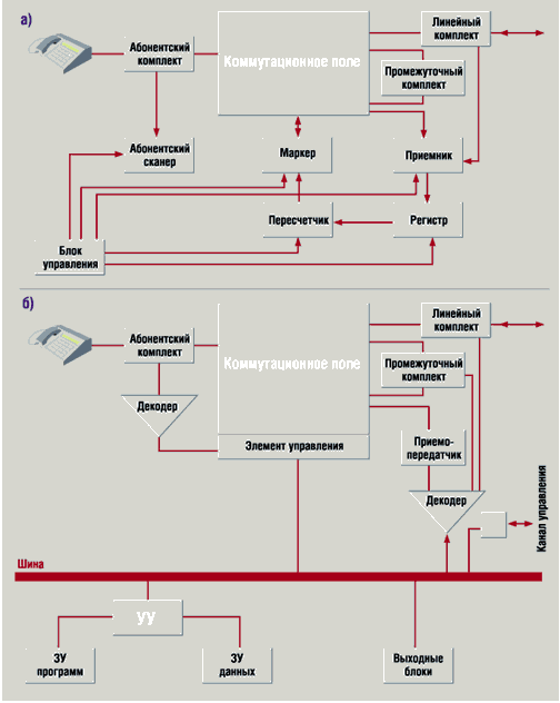 Рисунок 6. Схема организации станций: а - c распределенным электронным управлением; б - с централизованным электронным управлением.