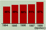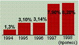 В 1997 г. доля Москвы на рынке международной связи России составила более 70%, причем альтернативные операторы предоставляли свыше 50% таких услуг. Динамика изменения доли доходов московских альтернативных операторов по годам приведена на рис. 3.