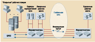 - Во всех функциональных подсистемах (подсетях серверов и рабочих мест) нужно реализовать протоколы TCP/IP (для удаленных рабочих мест IP-пакеты инкапсулируются в пакеты соответствующих подсетей), что дает возможность использования сервисов Internet в корпоративной сети.