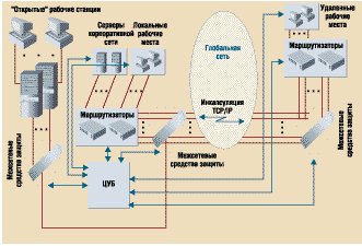 Межсетевые средства защиты можно разделить на открытые и корпоративные. Первые — это межсетевые экраны (МЭ), функционирующие на основе открытых протоколов Internet и предназначенные для подключения к сети корпорации открытых серверов Internet. Корпоративные МЭ позволяют организовать в корпоративной сети защищенное взаимодействие клиент—сервер с закрытыми серверами корпорации, в том числе по виртуальным каналам сетей общего пользования.