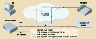 | Рис. 2. Пакетная передача речи и данных через телефонный шлюз (условные обозначения соответствуют принятым на рис. 1) |