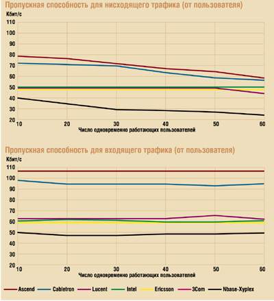Главный показатель, по которому другим изготовителям было трудно конкурировать с Ascend, -- это пропускная способность. В наших тестах на скорость передачи Max 6000 и продукт Cabletron опередили остальных участников более чем на 30%. Серверы Lucent, Intel, Ericsson и 3Com разошлись друг с другом в скоростях приема данных от оборудования пользователя и их транспортировки в обратном направлении не более чем на 3 кбит/с, так что третье место в этом состязании следует поделить между ними. И, наконец, EdgeBlaster совместного производства Nbase--Xyplex передавал данные в прямом и обратном направлениях медленнее всех остальных (табл. 2).