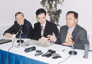 Вице-президент отделения Мotorola по Восточной и Центральной Европе Джон Палле (на фото слева) рассказал о стратегическом альянсе, заключенном с компанией Cisco Systems с целью создания открытой цифровой беспроводной системы доступа в Internet. Фирмы намерены инвестировать в долгосрочный проект около 1 млрд долл. В ходе его реализации будет создана единая унифицированная платформа доступа в Internet для всех существующих в мире стандартов сотовой связи, а также для мобильных систем третьего поколения. В рамках этого проекта предполагается в следующем году оснастить все цифровые телефоны компании Motorola встроенными Internet-браузерами.