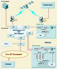Управление корпоративной сетью осуществляется из центрального офиса, который является шлюзом в телефонную сеть общего пользования (ТфОП) и Internet. Для подключения офиса в Саяногорске служит арендованный спутниковый канал, а в Самаре — арендованный кабельный канал (см. рисунок). При этом для подключения самарского филиала с целью уменьшения числа арендованных каналов была использована технология «голос поверх IP» (VoIP), т.е. по общему каналу связи одновременно передаются речевой трафик и данные.