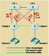7. Пункт сигнализации В выбирает одно из звеньев сигнализации (например, ВD) и передает по нему сообщение ACM для маршрутизации к станции 1. Одновременно станция 2 проключает разговорный тракт в обратном направлении к станции 1, посылает по этому тракту тональный сигнал и, наконец, направляет звонок по линии к вызываемому абоненту В.