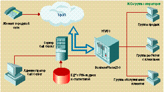 В структуре современного центра обработки вызовов может вообще не быть традиционных УПАТС. Такой Call Center строится на базе технологии Voice over IP. Этот вариант центра обработки вызовов целесообразно использовать в том случае, когда нужно обеспечить специфический сервис для достаточно большого числа клиентов. Стоимость заказных программ в этом случае довольно велика, а объем пусконаладочных работ намного превышает таковой при создании ACD CTI. Однако всегда следует учитывать и другую сторону решения задачи — адекватность технологических решений требованиям расширяемости системы. У каждой УПАТС есть свое пороговое значение количества обрабатываемых телефонных вызовов. Например, для BusinessPhone-250 это тысячи, для MD110 — десятки тысяч вызовов в сутки. Но сегодня назрела необходимость в обработке нескольких десятков и даже сотен тысяч вызовов в сутки. И Call Center на базе УПАТС не всегда в состоянии справиться с таким «валом».