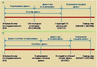 | Рис. 3. Сегменты в потоке данных на стороне отправителя (а) и получателя (б) |