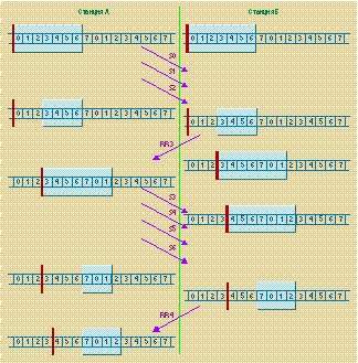Станция Б после получения части сегментов передает сообщение RR3, из которого следует, что все сегменты по S2 включительно получены и станция Б готова принять S3, а также еще шесть сегментов, следующих за ним. Для станции А эта информация эквивалентна разрешению на передачу семи сегментов, начиная с S3. Кроме того, станция А может очистить свою буферную память от копий первых трех сегментов, как успешно принятых. Теперь станция А передает S3, S4, S5 и S6, а cтанция Б в ответ отправляет подтверждение RR4 на получение S3 и разрешает отослать сегменты от S4 до S2 (где S0–S2 относятся уже к следующей последовательности из семи сегментов). Однако на момент получения станцией А этого подтверждения S4, S5 и S6 уже были посланы, следовательно, она может расширить свое окно отсылки и отправить четыре сегмента, начиная с S7 (правда, сегменты S4–S6 пока должны оставаться в буфере).