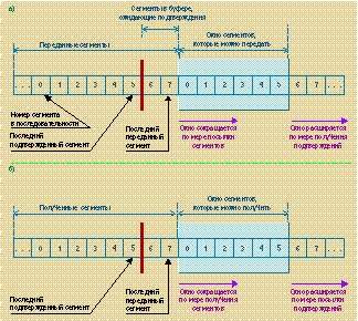 Рассмотрим этот метод подробнее на примере обмена данными между станциями А и Б. Станция Б выделяет буферное пространство для приема n сегментов, которые станция А может отправить, не дожидаясь индивидуальных подтверждений их приема. Для идентификации подтверждений о принятых сегментах каждый из них помечен своим номером в последовательности данных. Станция Б посылает подтверждение о получении текущего сегмента, включающее в себя номер в последовательности следующего ожидаемого сегмента. Это подтверждение косвенно извещает станцию А о том, что станция Б готова принять следующие n сегментов, начиная с указанного номера.
