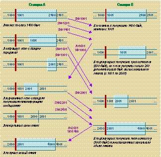 На практике обе стороны одновременно задействуют режимы отсылки и приема, поскольку данные могут передаваться в обоих направлениях (режим дуплексной передачи). Механизм выделения лимита достаточно гибок. В качестве примера рассмотрим ситуацию, в которой последним сообщением, посланным станцией В, было (A = i, W = j). Последний байт данных, полученный станцией В, имел номер i - 1. В результате для увеличения лимита до значения k при выполнении условия k > j и отсутствия дополнительных данных станция В формирует сообщение (A = i, W = k), а для подтверждения входящего сегмента, содержащего m байт данных (m < j), без получения дополнительного лимита станция В формирует сообщение (A = i + m, W = j - m).