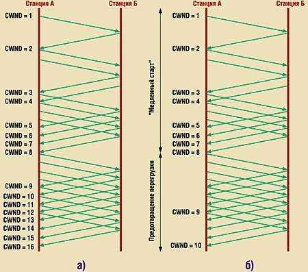 Второй способ заключается в использовании сразу после формирования соединения минимального размера окна отсылки, который ни при каких обстоятельствах не вызовет перегрузку сети. «Изюминка» этого подхода — наращивание размера окна отсылки с помощью алгоритма «Медленный старт».