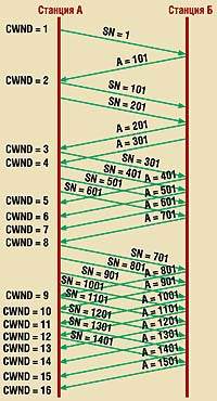 При создании нового соединения TCP устанавливает окно перегрузки CWND равным единице. Это означает, что отправитель может послать только один сегмент и должен дождаться подтверждения о его успешном приеме, прежде чем отправить следующий сегмент. Каждый раз, когда поступает подтверждение, значение окна CWND увеличивается на единицу. Так происходит до тех пор, пока размер данного окна не достигнет максимального значения.