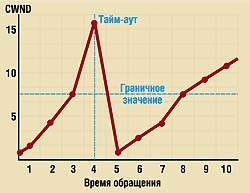 На рис. 12 окно CWND шириной восемь сегментов задает граничное значение. И если для достижения тайм-аута здесь понадобилось четыре времени обращения RTT, то для повторного вхождения в этот режим потребуется уже одиннадцатикратное время RTT.