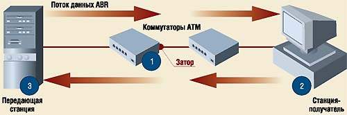 В сети, поддерживающей технологию ABR, коммутатор с помощью станции-получателя информирует передающую станцию о возникновении затора. Используя тот или иной механизм управления потоками, коммутатор может запросить новую скорость передачи данных, благодаря которой, по его расчетам, снизится до минимума переполнение его буферов, уменьшится количество теряемых ячеек и, таким образом, повысится пропускная способность канала. А это, в свою очередь, предотвратит рост перегрузки, связанный с повторной передачей потерянных кадров под IP.