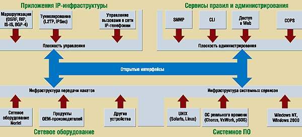 Позиционируя свой продукт в качестве универсальной платформы для разработки всевозможных сетевых приложений и внедрения новых услуг в IP-сетях, Nortel все-таки делает основной упор на средства маршрутизации. Недаром же в первой фазе вывода Open IP Environment на рынок пользователям предложены инфрастуктура передачи пакетов и высокопроизводительные функции маршрутизации (по протоколам OSPF и BGP-4).