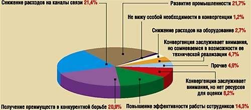 Проведенный нами опрос, в котором участвовали 364 компании, показал, что на решение руководства организации о переходе к интегрированной сети влияют различные факторы. Практически каждый пятый респондент (20,9%) из числа сотрудников ИТ-подразделений считает, что интеграция необходима для повышения конкурентоспособности компании (см. диаграмму). Примерно 40% респондентов видят в конвергенции путь к повышению эффективности использования сети сотрудниками компании и к снижению расходов на каналы связи.