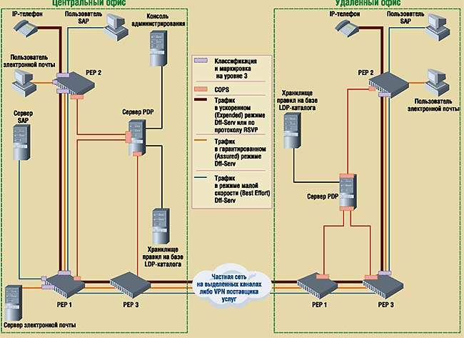 | Типичная сеть с поддержкой администрирования на основе стратегий и механизмов обеспечения QoS потребует интеграции множества серверов, LDAP-каталогов, использования разных протоколов и сетевых устройств (PEP 1 — коммутатор/маршрутизатор опорной сети; PEP |