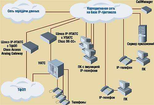 CCN отличает довольно элегантное решение по использованию кабельной инфраструктуры локальных сетей в качестве абонентских телефонных линий. Это позволяет существенно снизить расходы при создании или модернизации телекоммуникационных офисных сетей. На рисунке представлена система офисной телефонии, в которой реализован один из вариантов совместной работы обычной УПАТС и IP-УПАТС.