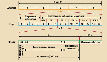 Информация, передаваемая с навигационного КА, жестко структурирована. Группа из 15 строк объединена в кадр длительностью 30 с, а пять навигационных кадров образуют суперкадр длительность 2,5 мин. Границы строк, кадров и суперкадров всех КА синхронизированы так, чтобы погрешность не превышала 2 мс. Cимвольная синхронизация для метки времени осуществляется с помощью меандра, сама метка служит для строчной синхронизации навигационных данных.