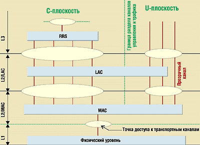 Канальный (MAC) уровень, состоящий из L2/LAC- и L2/ MAC-подуровней, является транспортной средой между верхними и физическим уровнями. Он предоставляет механизмы управления сетевыми ресурсами и поддержку протоколов с учетом различных требований к достоверности, качеству обслуживания и времени ожидания. На первом подуровне, L2/LAC, формируются прямые логические каналы (типа «точка—точка») с равноправными объектами сетевого уровня. Второй подуровень, L2/MAC, обеспечивает управление доступом к радиоканалам и координацию радиоресурсов между различными логическим каналами LAC-подуровня, что позволяет свести к минимуму конфликты обслуживаемых объектов (мобильных станций). Наконец, этот подуровень отвечает за доставку показателей качества обслуживания, которые используются на подуровне L2/LAC.