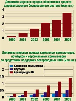 «Для Cisco такое эволюционное развитие совершенно естественно прежде всего потому, что компания внесла значительный вклад в становление рынка кабельных сетей передачи данных, — подчеркивает Ларри Свеси, вице-президент исследовательской фирмы Allied Business Intelligence (ABI). — Теперь изрядная доля данных начинает мигрировать в эфир. Отсюда изменение приоритетов у поставщиков информационных услуг в Internet, операторов беспроводной связи и производителей аппаратных и программных средств. Все они проявляют неподдельный интерес к стандартам, которым предстоит регламентировать обмен трафика по беспроводным сетям. В течение десятилетия мы будем наблюдать неуклонное возрастание доли данных, передаваемых по беспроводным каналам». На ближайшие пять лет специалисты ABI прогнозируют устойчивый рост продаж абонентских устройств широкополосного доступа и оборудования для беспроводных локальных сетей (см. диаграммы).