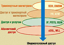 Архитектуру таких сетей можно представить в виде многоуровневой модели, в рамках которой абоненты получают доступ к магистрали с помощью различных технологий абонентского и сетевого доступа. При этом тенденция развития сетей такова, что средства и системы широкополосного доступа мигрируют из области сетевого, по сути корпоративного доступа в область абонентского.