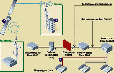 1.На Южном полюсе: голосовой трафик от IP-телефонов Cisco направляется по ЛВС лабораторий НАСА. Аппаратура от Cisco и Packeteer используется для маршрутизации голосового трафика к каналу связи Земля—спутник.