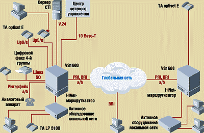 В VS1500/VS1600 предусматривается установка платы маршрутизатора, который позволит непосредственно подключать к станции локальную сеть Ethernet. Благодаря этому появляется возможность объединять в единое целое локальные сети двух офисов, поддерживать удаленный доступ к корпоративной сети, осуществлять подключение к провайдерам Internet. При реализации соединения типа ЛВС—ЛВС HiNet Router, а именно так называется этот маршрутизатор, может группировать до восьми каналов В для соединения через сеть ISDN.