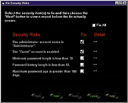 Работа с SFProtect начинается с того, что администратор безопасности подключается к серверному компоненту, который работает как служба NT-сервера. Чтобы проверить сервер, достаточно нажать клавишу «Audit». По завершении исследования его результаты выводятся на экран, но можно получить и твердую копию отчета в формате HTML. Для устранения найденных уязвимых мест путем автоматического конфигурирования средств защиты используется тоже одна клавиша — «Fix» (рис. 2).