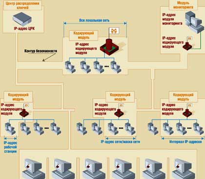 Криптошлюз идентифицирует «границы» контура безопасности, в пределах которых он должен «закрывать» группу локальных сетей. ПО фильтрует поток данных (разделяя их на кодируемые и не кодируемые), поступающих от закрываемой им группы локальных сетей и, если адрес назначения пакета находится внутри контура безопасности, кодирует помеченные пакеты. В составе криптошлюза имеется также программа управления ключами и аутентификации адресатов (демон), в чьи функции входят и взаимная аутентификация шлюзов сети, и поставка информации в центр мониторинга. Самозащита шлюза базируется на нескольких механизмах обеспечения безопасности, в числе которых процедура аутентификации и контроль целостности.