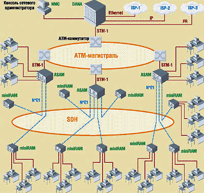 В качестве центрального ядра сети предлагается использовать уже построенную АТМ-магистраль, состоящую из нескольких коммутаторов. Подключить к ядру выносные узлы ADSL можно по каналам Е1 с использованием уже существующей сети SDH.