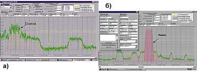 | Рисунок 9. Пример фиксации внешнего местного (а) и собственного (б) помеховых излучений |