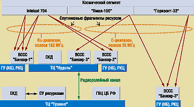 Земной сегмент ВССС, построенный в том числе и на станциях Кu-диапазона корпорации NEC и состоит (см. рис. 3) из ЦЗС, системы управления (СУ) сетью и региональных подсистем, в каждую из которых входят узловая земная станция (УЗС) и до 50 абонентских земных станций (АЗС). ЦЗС находится в зоне обслуживания КА. УЗС размещаются в ГУ (НБ) областей, краев и республик, а АЗС — в соответствующих РКЦ. Наличие на центральной ЗС двух антенных постов позволяет в случае необходимости работать с двумя КА одновременно. ССС полного состава будет включать около 1200 ЗС, причем их количество для сетей «Банкир-1», «Банкир-2» и «Банкир-3» соотносится примерно как 6:5:1. Сегодня развернуто уже более 600 ЗС (свыше 50% от общего числа), а в эксплуатации находятся около 300 станций (25% от общего числа). Существующая сеть предоставляет следующие услуги: