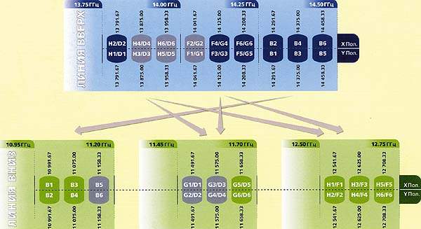 Частотный план спутника SESAT (ширина полосы каждого ретранслятора 72 МГц, выходная мощность 95 Вт)
