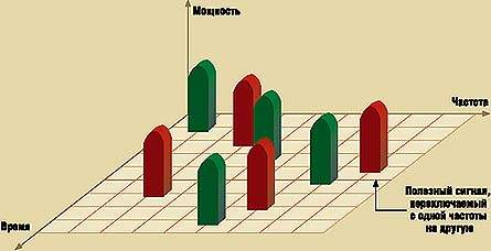 Принцип скачкообразной перестройки частоты в CDMA-системах воплощается следующим образом. Любой бит передается в виде комбинации из N частот, причем на каждой частоте передается своя псевдослучайная последовательность (ПСП). В течение заданного временного интервала T несущая остается неизменной, а по его истечении она скачкообразно изменяется. Алгоритм переключения частоты несущей для каждого абонента индивидуален, благодаря чему возможна одновременная работа большого числа абонентов в общей полосе частот. Полный набор используемых частот (hop set) может быть достаточно велик, однако в каждый заданный алгоритмом интервал времени мобильная станция излучает только на одной частоте (рис. 2).