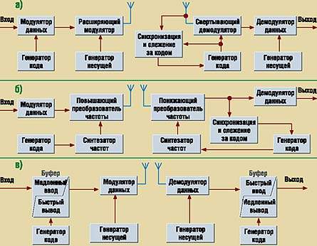 | Упрощенные структурные схемы передатчиков и приемников для систем DS-CDMA (а), FH-CDMA (б) и TH-CDMA (в) |