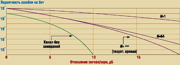 | Характеристики помехоустойчивости каналов связи, использующих MC-CDMA, при наличии в них релеевских замираний (N — число несущих) |