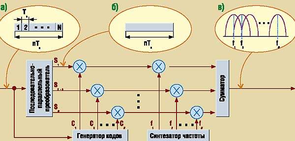 | Передатчик сигналов MC-CDMA: а) входной сигнал; б) сигнал на выходе преобразователя; в) выходной сигнал (с1, c2...cN — кодовые последовательности абонентов; f1, f2, ..., fN — несущие частоты) |