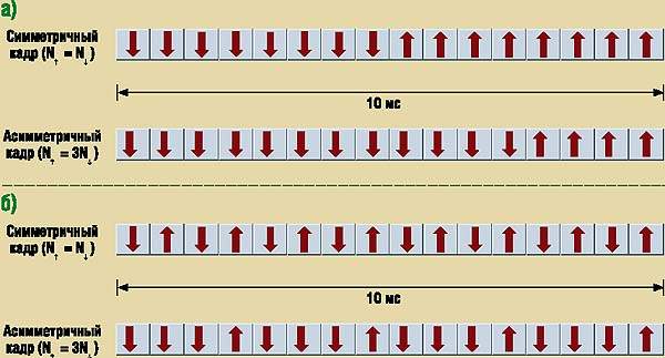 | Структура симметричного и асимметричного кадра: а) конфигурация с одноточечной коммутацией; б) конфигурация с многоточечной коммутацией |