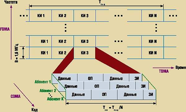 | Структура кадра TD-CDMA (КИ — канальный интервал, ЗИ — защитный интервал, ОП — обучающая последовательность) |
