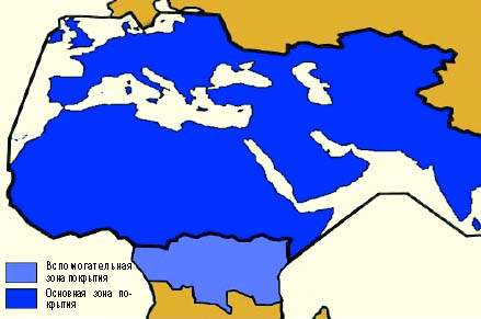 | Зона покрытия КА Thuraya 1 (точка стояния 44? в.д.) |