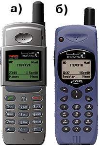 Базовое абонентское устройство — портативный терминал типа «телефонная трубка» — оснащено антенной, выполненной в виде четырехзаходной спирали. Для его питания используются ионно-литиевые батареи емкостью 650/1200 мАч. Максимальное время разговора в режиме спутниковой связи составляет 2,4 ч (батарея на 650 мАч) или 4 ч (1200 мАч), а в режиме ожидания — 34,1 ч (650 мАч) или 63 ч (1200 мАч). Абонентские устройства для системы Thuraya разработаны двумя производителями оборудования спутниковой связи — Acsom и Hughes Network Systems (рис. 4); по дизайну они практически не отличаются от обычных сотовых GSM-телефонов.