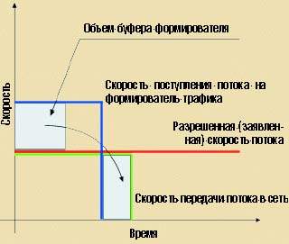Формирователи и фильтры. Пакеты, не удовлетворяющие спецификации, т.е. прибывающие на вход измерителя быстрее, чем нужно, могут быть отброшены фильтром. Альтернативный вариант предполагает искусственную задержку отдельных пакетов, называемую формированием трафика, благодаря которой средняя скорость потока приходит в соответствие со спецификацией. Естественно, для промежуточного хранения задерживаемых пакетов требуется достаточное буферное пространство.