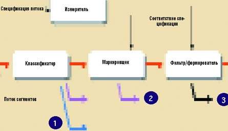 | Компоненты классификатора и кондиционера 1. Потоки разделяются по классам сервиса. 2. Не соответствующие спецификации сегменты данных маркируются как относящиеся к менее приоритетному классу. 3. Не подлежащий формированию трафик, характеристики которого не соответствуют указанным в спецификации, отбрасывается. |