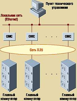 Архитектура системы технического управления тесно связана со структурой элементарных сетей (рис. 5). Информация, относящаяся к элементарной сети, собирается в рабочей БД, реализованной на базе программно-аппаратного комплекса (Оperation and Maintenance Computer, OMC) на платформе ПК с ОС Unix, который связан с главным коммутатором каналом Х.25. OMC объединены в локальную сеть каналами Ethernet, и к любому их них из пункта технического управления (Technical Management Position, TMP) обеспечивается доступ при помощи дисплея «мультиэлементарной» сети. Команды оператора, посылаемые с Unix-терминала, реализуются на уровне TMP. Пункт технического управления служит для получения общей картины состояния сети и предоставляет доступ к полному набору функций контроля (вплоть до уровня плат) через удобный интерфейс.